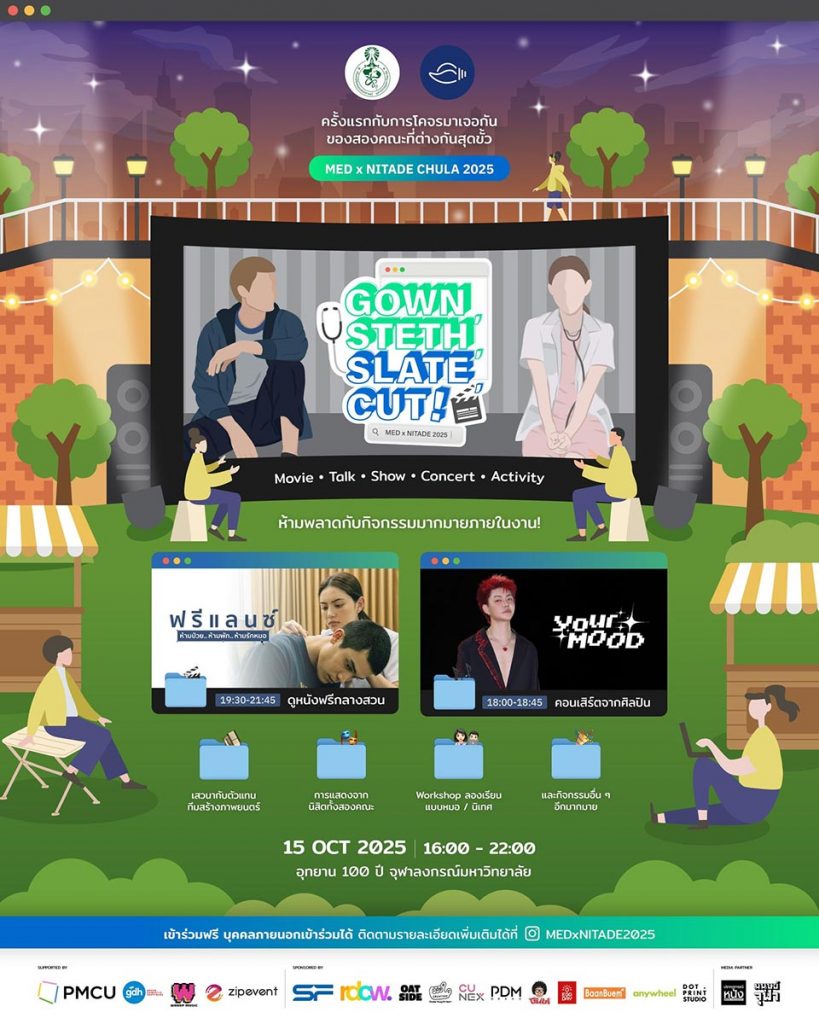 ครั้งแรกกับการโคจรมาเจอกันระหว่างนิสิตคณะแพทยศาสตร์และคณะนิเทศศาสตร์ จุฬาลงกรณ์มหาวิทยาลัย โดยนิสิตทั้งสองคณะได้ร่วมกันจัดงานแฟร์ฉายกลางแปลงที่มีชื่อว่า “MEDxNITADE CHULA 2025: Gown, Steth, Slate, Cut!”